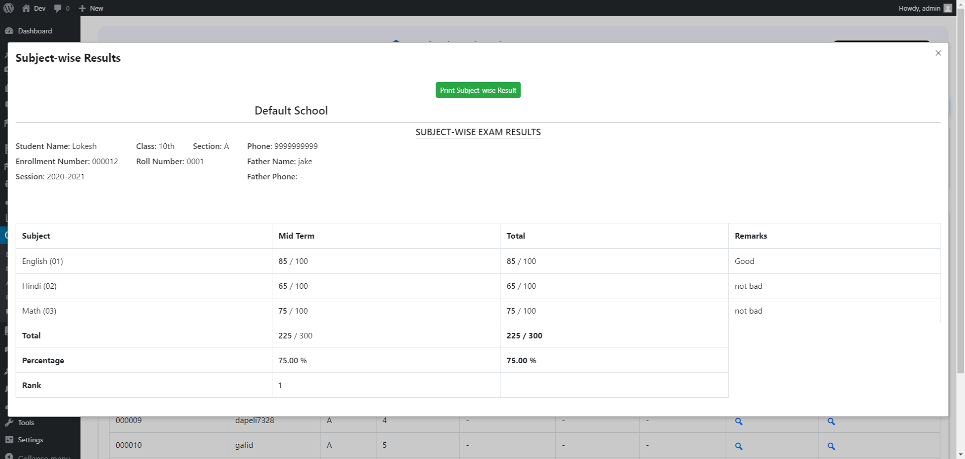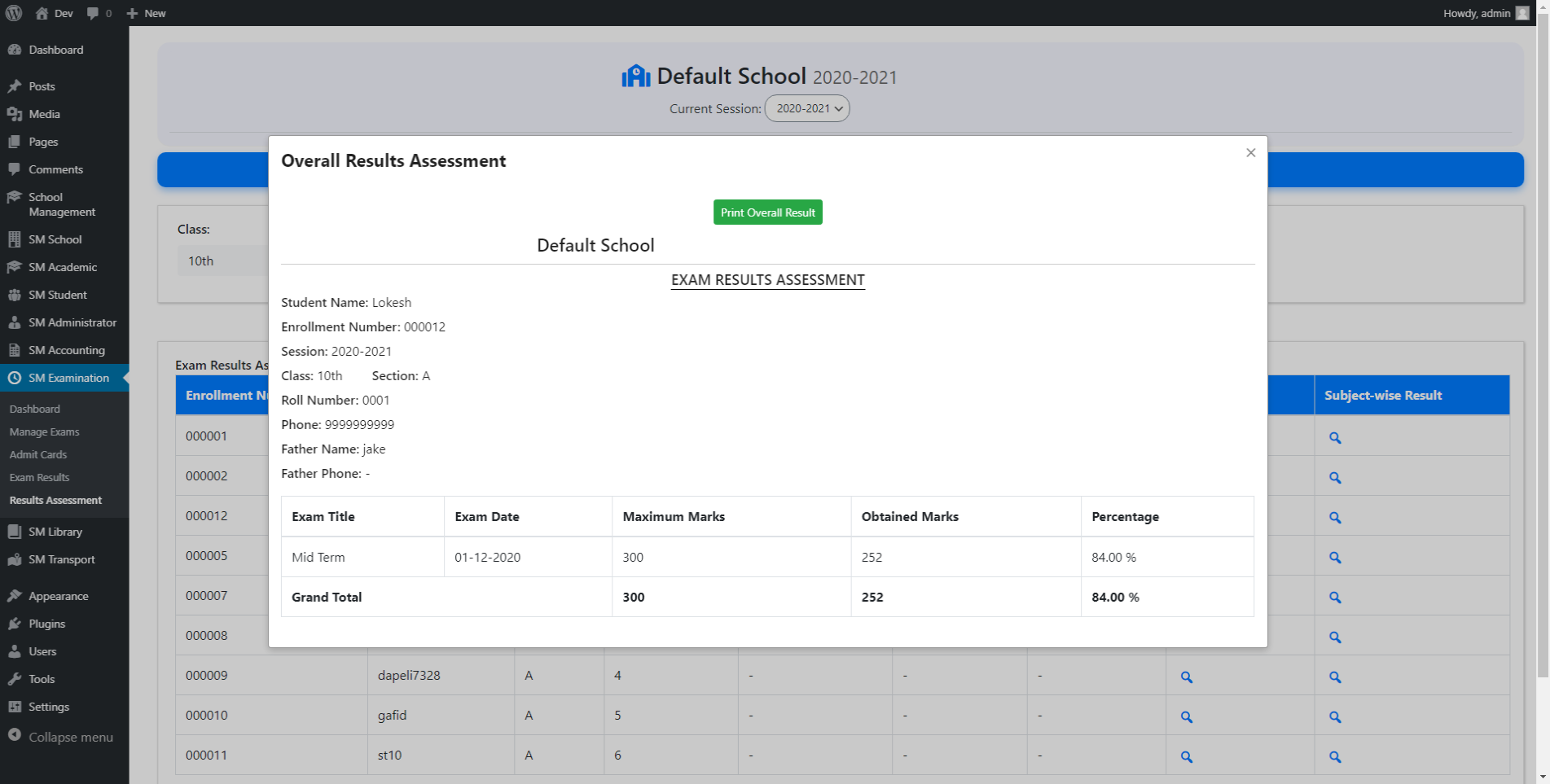 2). Here, you can view overall results assessment of a student.